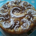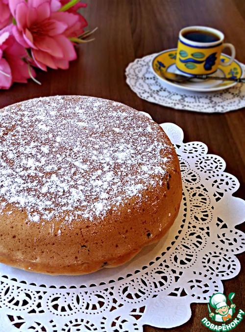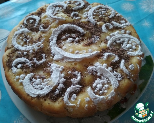 Готовый пирог извлечь с помощью подставки-пароварки (или обычной тарелки) и присыпать сахарной пудрой.
