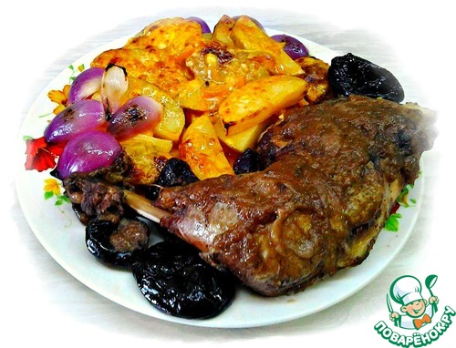 Поливаю окорочка соусом, выкладываю чернослив и запечённый лук.
