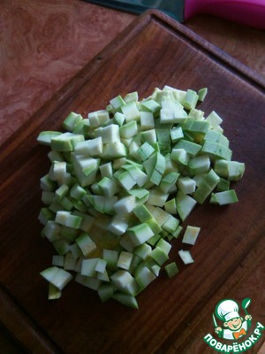 Не большой кабачек режем кубиками и засыпаем в сковороду