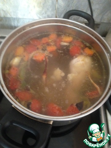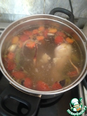 Когда запеклись, выложить в готовый бульон и варить ещё минут 15