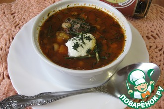 В оригинале рецепта суп варится на бульоне из копченых ребрышек, у меня на настоящий момент их не было, и я решила использовать копченую грудинку, мелко порезала её и запекла вместе с овощами, можно использовать копченые колбаски, ну а если вы вегетарианец, то можно и просто овощной бульон, фантазируйте ))