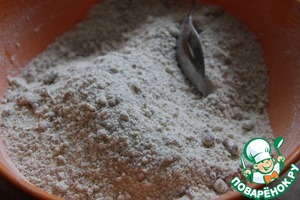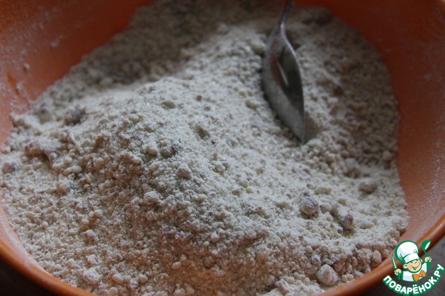 Тесто фило разморозить в упаковке. Приготовить ореховую начинку для пирога: смешать муку, рубленные орехи, соль, сахар, муку с разрыхлителем, ваниль