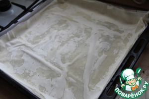 Противень застелить бумагой для выпечки. Уложить 1 лист теста фило и слегка смазать растопленным сливочным маслом (я сбрызгивала растительным). На него уложить второй. Процедуру повторять с 5-ю листами