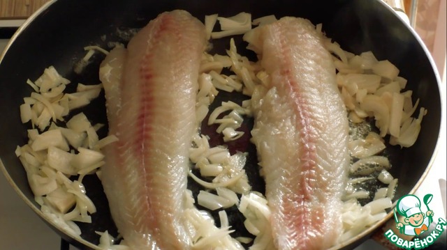 2. К обжаренному луку добавьте филе минтая и тушите его на медленном огне в течении 10 минут.