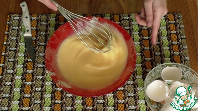 3. Пока минтай тушится, приготовьте омлет. Для этого взбейте яйца с молоком, не забудьте про соль.