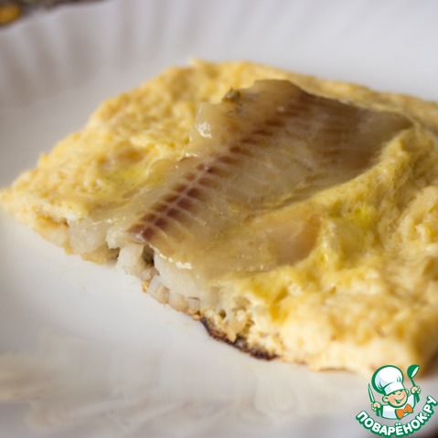 4. Залейте рыбку омлетом и тушите блюдо на медленном огне до полной готовности омлета.