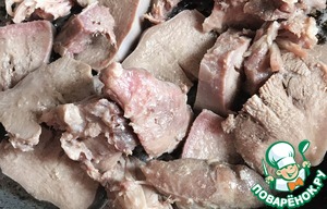 В первую очередь поставим вариться в подсоленной воде язык на 2 часа, можно это сделать заранее.
