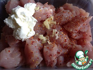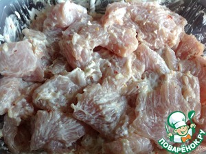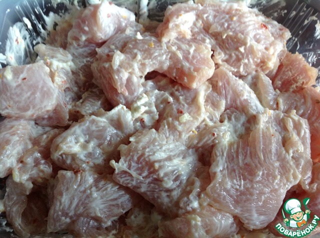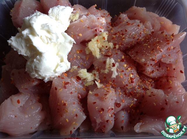 Индейку нарезать кубиками среднего размера, приправить солью и острым перцем чили. Добавить йогурт, пропущенный через пресс чеснок и оливковое масло.