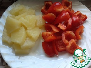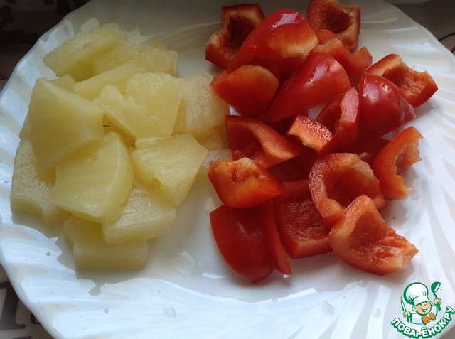 Ананас нарезать крупными ломтиками. Перец очистить и нарезать ломтиками.