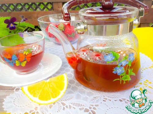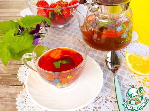 Для вечерних летних посиделок предлагаю угоститься освежающим чаем с имбирём, свежей клубникой, лимоном и листьями смородины.
