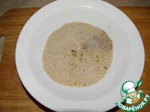 Панировочные белые сухари смешать с солью, перцем, приправами по вкусу