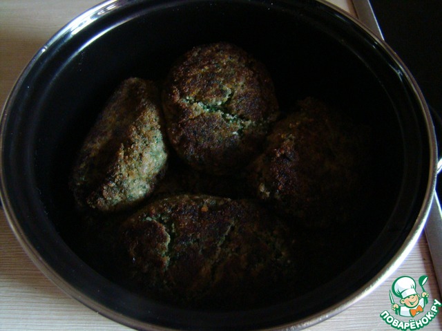 Котлеты сложить в кастрюлю, влить отвар от крапивы и потушить на медленном огне 5 минут.