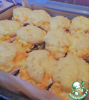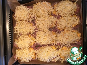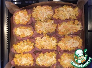 И в конце посыпаем наш будущий ужин тертым сыром. Отправляем в духовку на 30 минут при температуре 180 градусов.