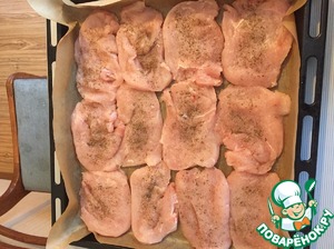 Разрезаем филе индейки на порционные кусочки, отбиваем, солим перчим по вкусу.