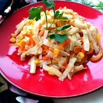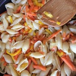 Соломкой порезать лук, морковь и перец. Макароны отварить.