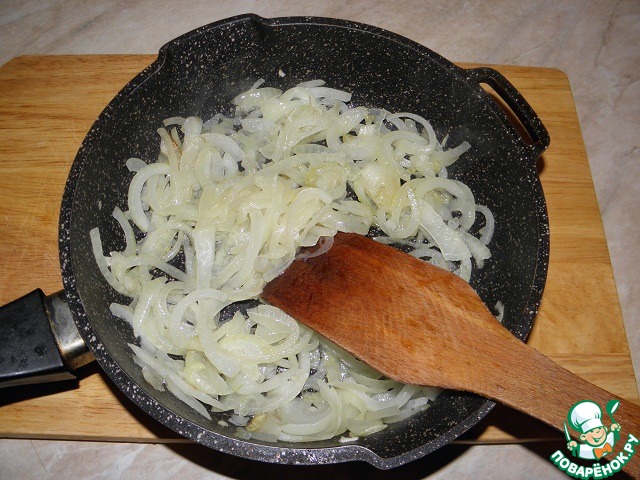 Лук режем полукольцами, обжариваем на сковороде (кто будет готовить в мультиварке, можно в ней)