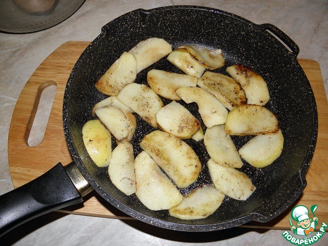 Затем в той сковороде, где жарилась печень, обжариваем яблоки на сильном огне