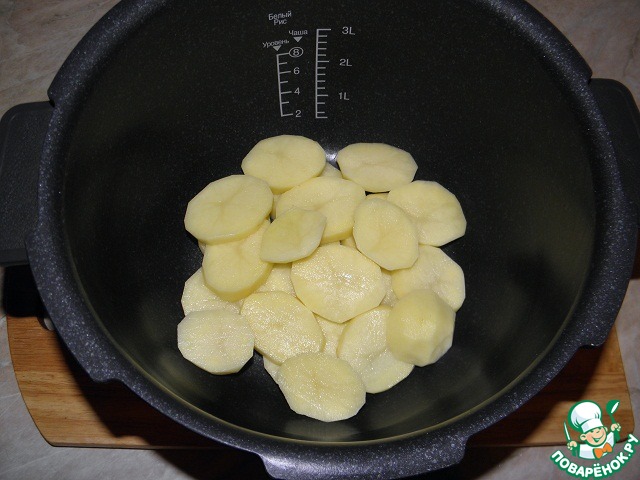 Добавляем сливки и начинаем готовить. Время приготовления зависит от мощности мультиварки и количества продуктов, если в режиме тушения - от 50 минут до 1,5 часа, главное, довести до готовности картофель.