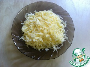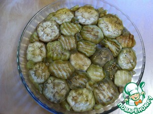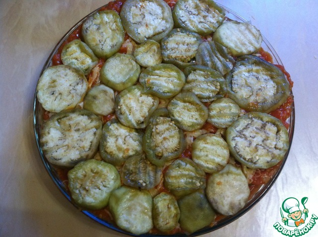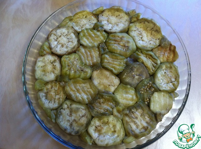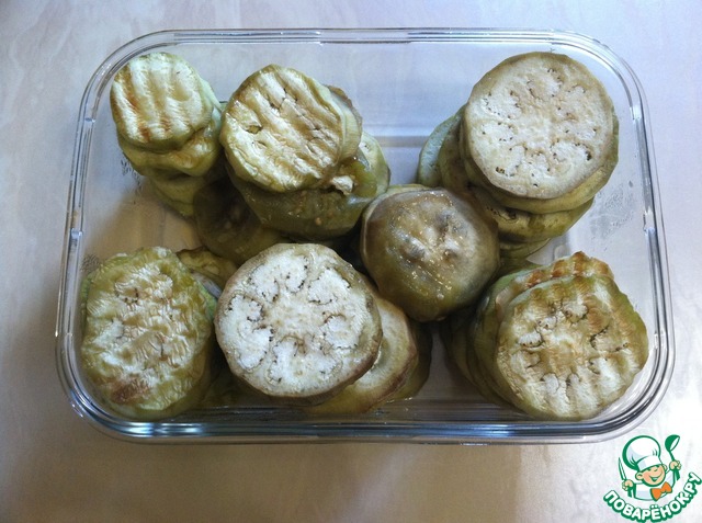 Баклажаны очистить от кожуры и порезать кружочками. Обжарить. Я обжаривала на электрогриле. Можно обжарить и на сковороде. Разделите баклажаны на 3 части, т. к. у нас будет несколько слоев.