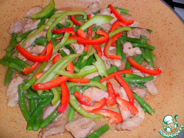 Разогреть сковороду с маслом и выложить мясо, перемешать и прожарить две-три минуты. Все готовим на небольшом огне.
