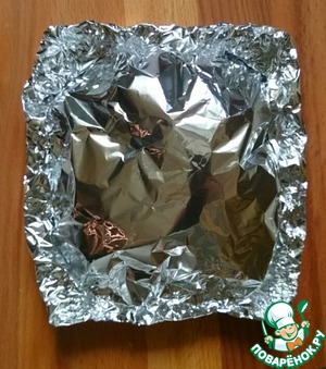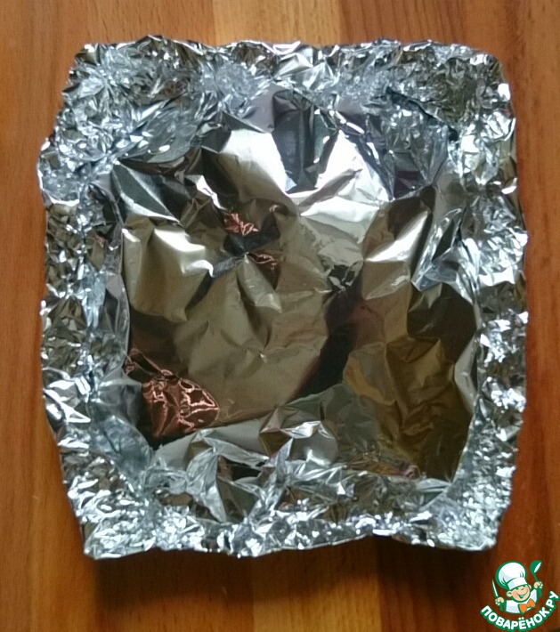 • "Конверт-тарелка" делается следующим образом: изначально фольгу нужно сложить пополам и развернуть, как книжку, затем "сырье" кладется на одну из сторон, все накрывается другой стороной. Края соединяются и заворачиваются.