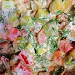 И поделюсь еще одним вариантом этого салата. Обжаренные кабачки, помидоры, вареное яйцо, сыр, зеленый лук и майонез (сметана).
