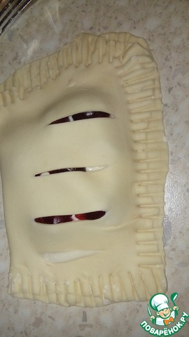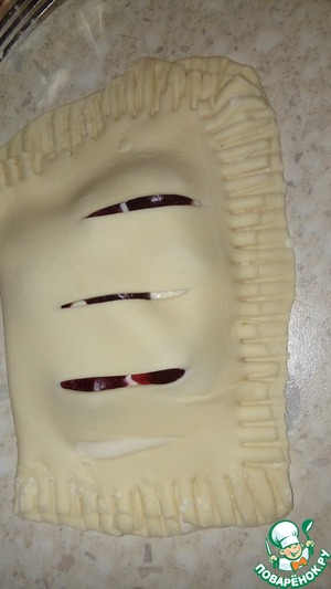 Упаковку теста делим на квадратики, раскатывает их до необходимого размера (у меня на 0,5 кг слоенного теста вышло 12 шт. на 2 противня, в этот раз брала не дрожжевое тесто). На одну часть выкладываем творог, сверху укладываем вишенки, количество зависит от того сколько у вас вишни и насколько вы ее любите))) На второй части делаем надрезы, но это не обязательно. Вишня у меня была из морозилки и, конечно же, без косточек.