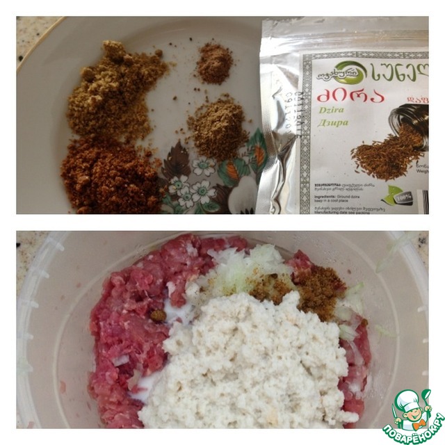 Соль и все специи перемешать и добавить к фаршу. Зиру потолочь в ступке или мельничке.