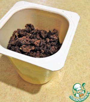 За белым шоколадом отправляем йогурт шоколадный и сверху посыпаем шоколадным печеньем.