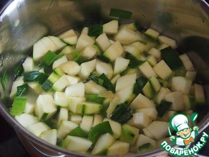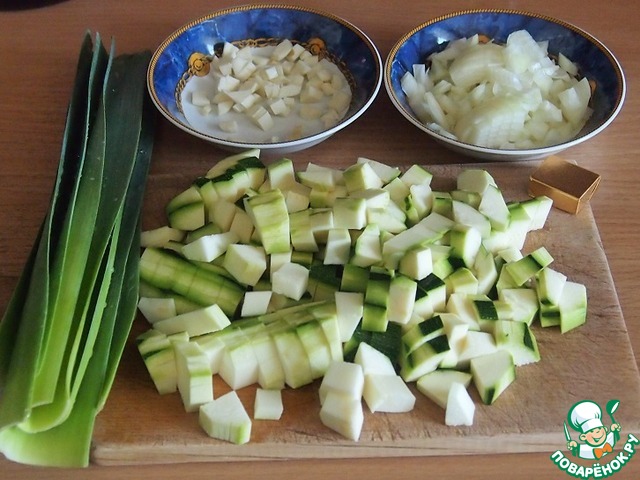 Нарезать лук, чеснок, кабачки и зеленую часть лука-порей. Если порей не очень небольшой, то можно использовать целый.