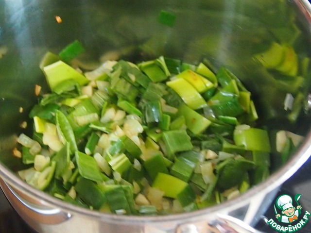 В кастрюле на масле поджарить лук, когда будет почти готов, добавить чеснок и обжарить. Затем добавить кабачки и лук-порей, немного потушить, чтобы лук обмяк.