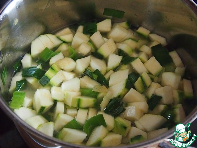 Добавить в кастрюлю воду или овощной бульон. Варить минут 15 до мягкости кабачков.