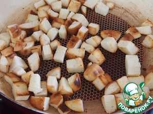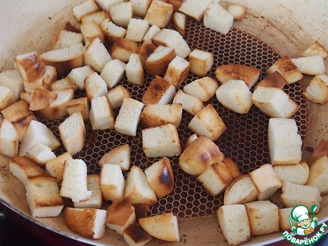 Хлеб нарезать кусочками и поджарить на сухой сковороде.