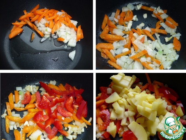 В кастрюле с толстым дном обжарить на растительном масле, лук и морковь до мягкого состояния, добавить чеснок, перец болгарский. Обжарить на среднем огне пару минут. Добавить картофель (нарезку овощей делайте как вам удобнее, мы любим мелкую).