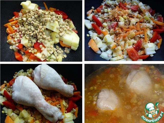 Чечевицу промыть, слить воду, добавить в кастрюлю. Добавить красный жгучий перец, приправу. На овощи выложить курицу. Залить кипятком. Количество воды регулируйте по мере необходимости, у меня густоватый суп. Варить, после закипания, на небольшом огне 20мин.