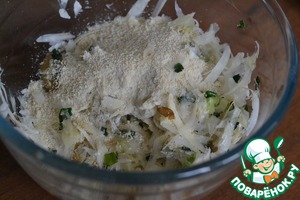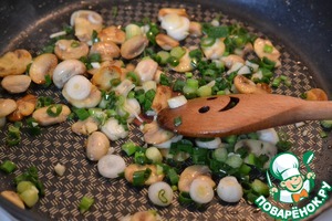 К оставшимся на сковороде грибам добавить мелко нарезаный зеленый лук и чеснок. Притушить на маленьком огне. -