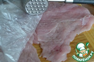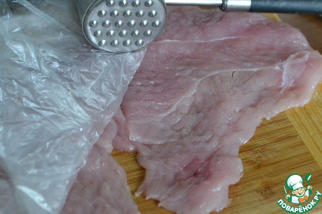 Грудку индюшки помыть, нарезать на отбивные и, накрыв пленкой, слегка отбить.