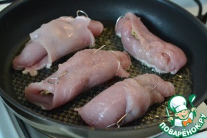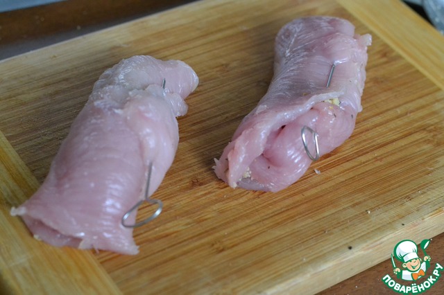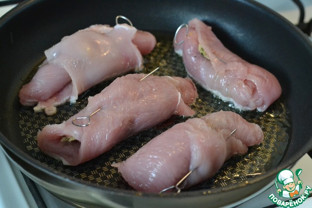 Скрутить отбивную рулетиком и скрепить шпажкой.