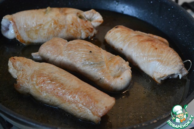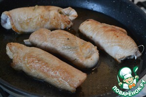 Обжарить рулетики на раскаленном подсолнечном масле до румяной корочки.