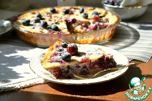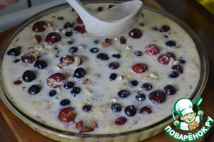 Форму с основой для пирога достать из духовки. Духовку не выключать. На горячую основу выкладываем черешню и чернику.