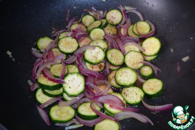 Порезанный лук (крупно), чеснок (мелко) и цуккини обжарить около 10 минут в горячем растительном масле.