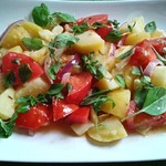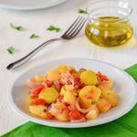 Отварной картофель очистить, нарезать не крупно. Помидоры нарезать на 4-8 частей.