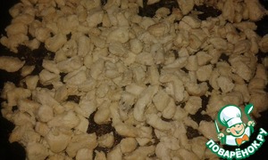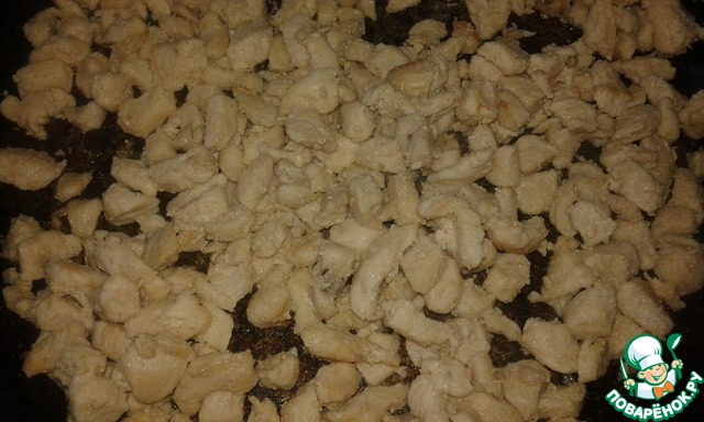 Куриное филе режем мелким кубиком и обжариваем в отдельной сковороде до золотистой корочки. |