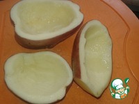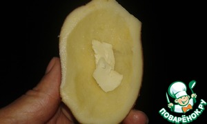 Картофель не чистим. Тщательно промываем. Разрезаем пополам и ложкой вынимаем серединку. Получились лодочки. |