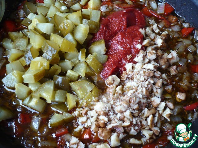 Добавить грецкие орехи, томатную пасту и соленые огурцы.