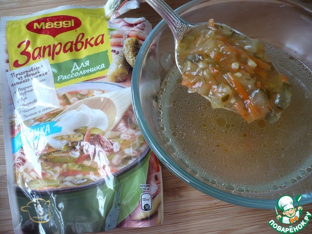 Возьмите оставшийся приготовленный бульон и разведите в нем 100 г. заправки для рассольника "Maggi".