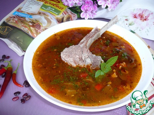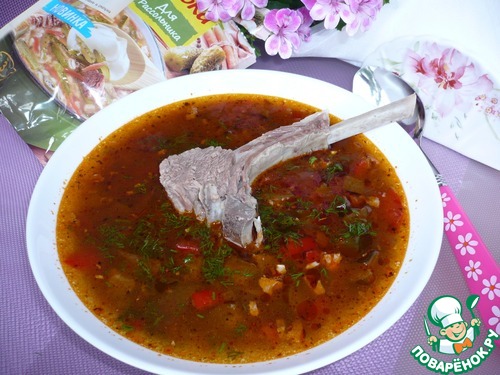Сначала надо сварить бульон из баранины. Я варила солянку из бараней корейки. Она не слишком жирная. Главное, чтобы было мясо с костью, иначе вкус будет не тот.
