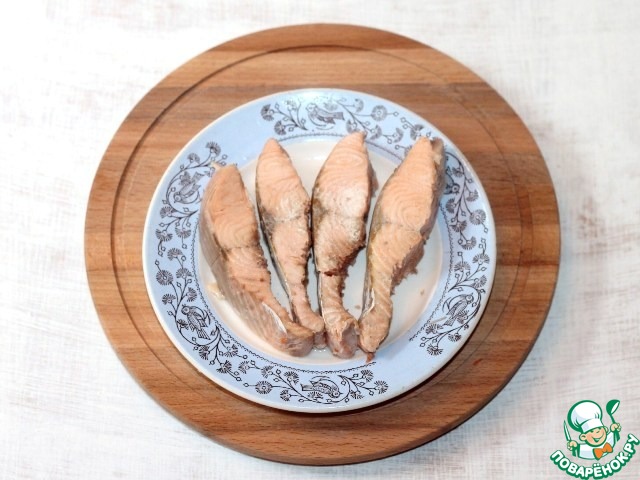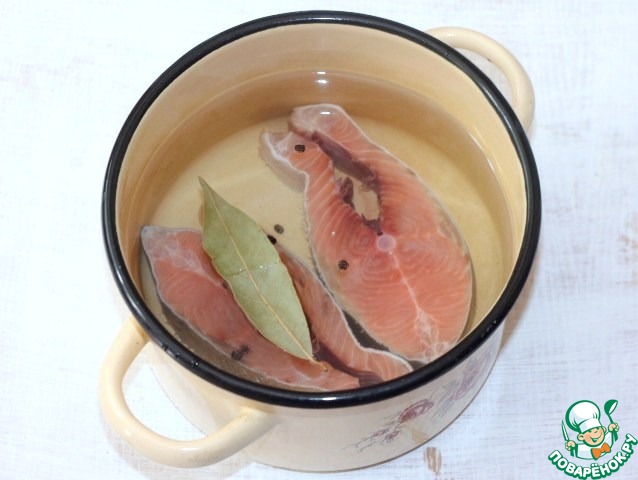 • 1. Приготовим рыбный бульон. Отвариваем рыбу с добавление лаврового листа и перца горошком.