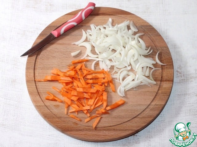 • 3. Приготовим пассеровку. Лук и морковь очищаем и нарезаем. Обжариваем лук на разогретом масле до прозрачности. Добавляем морковь. Пассеруем 2-3 минуты.
