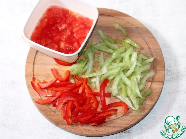 • 4. К пассеровке добавляем порезанный соломкой сладкий перец, сельдерей и очищенный от шкурки, и мелко порезанный помидор. Тушим под крышкой от 3-5 минут до готовности.